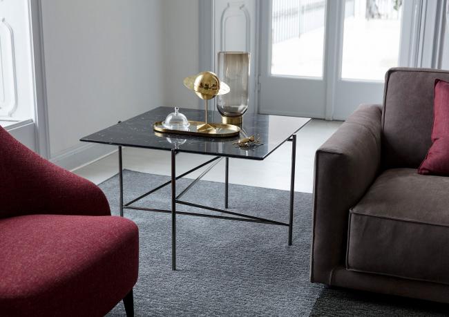 Riff is a low, square coffee table measuring 60 x 60 cm ideal to be placed in front of your sofa. The top is in marble and the structure is in chromium-plated black gloss steel.