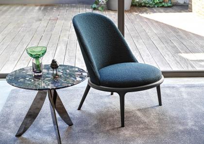 In this environment of dynamic and extremely modern tones, the Kim armchair upholstered in Bouclè fabric is combined with the Circus coffee table with Marinace Black marble top.